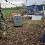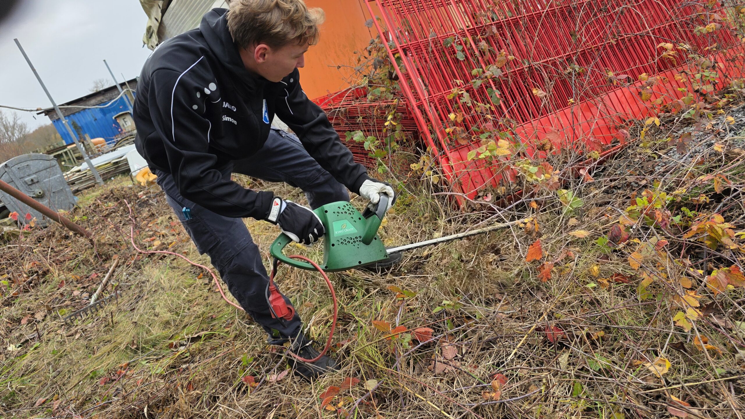 Währenddessen ging eine zweite Gruppe an den hinteren Bereich des Geländes. Mit Heckenschere und weiteren Maschinen rückten wir dem dichten Bewuchs zu Leibe. Die Arbeit hatte es in sich – und sogar unser Werkzeug zeigte erste Ermüdungserscheinungen: Ein Rechenstiel zerbrach (wirklich jammerschade!). Doch davon ließen wir uns nicht aufhalten und machten motiviert weiter.
