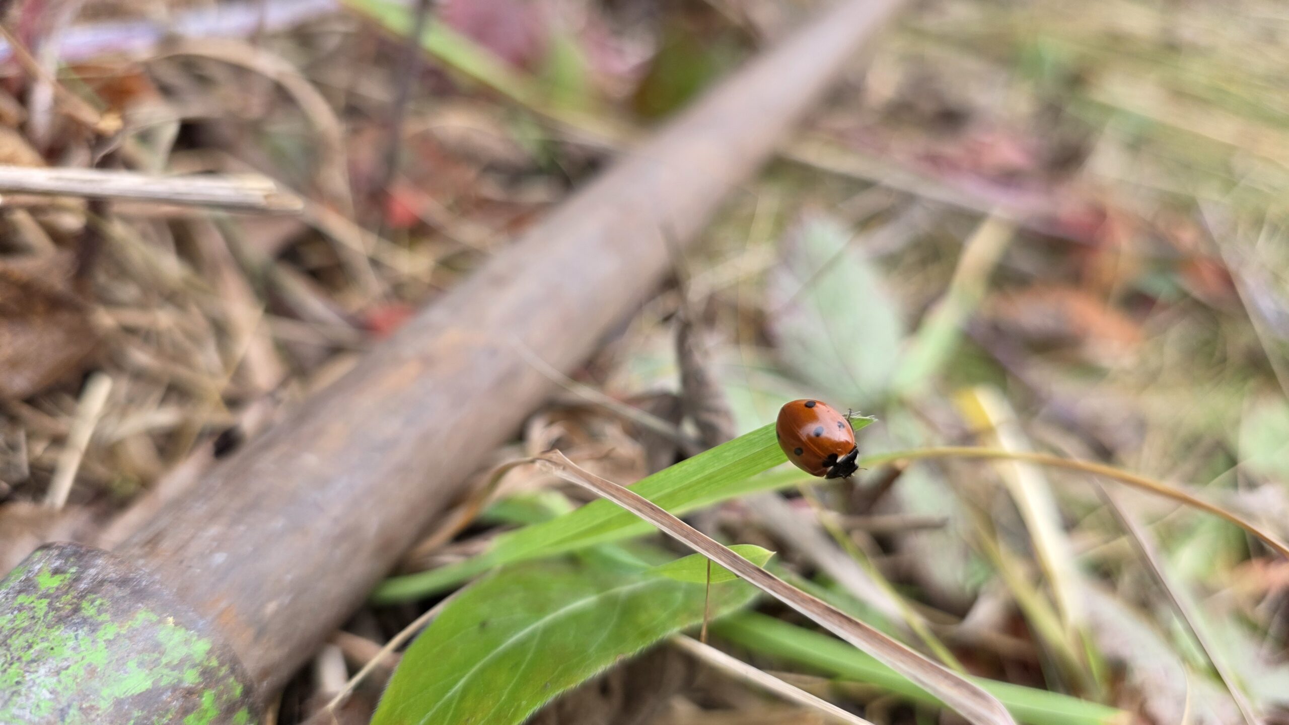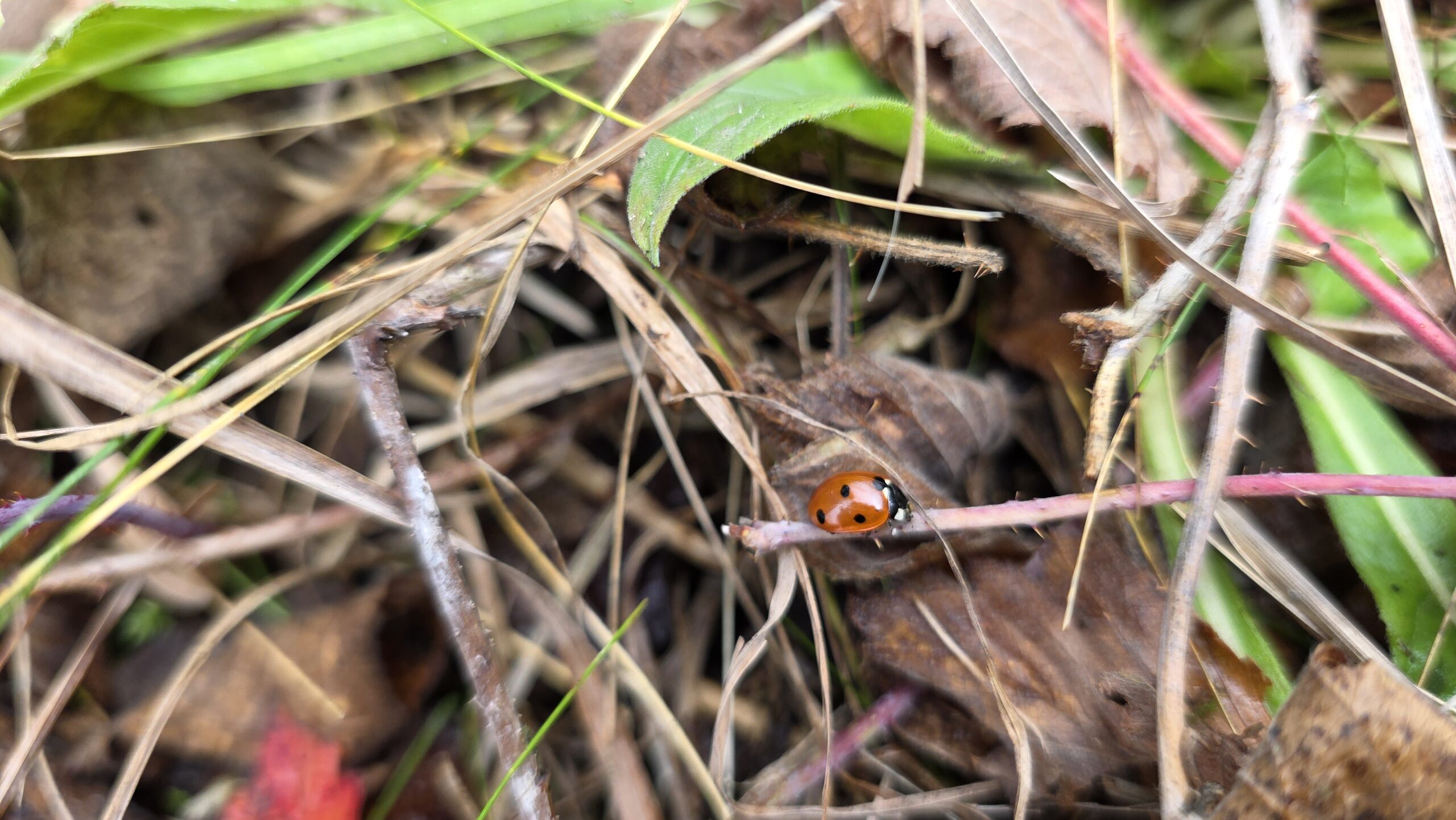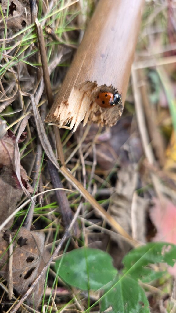 Ein kleiner Lichtblick im Arbeitsalltag sorgte jedoch für besondere Aufmerksamkeit: Auf dem abgebrochenen Rechenstiel entdeckten wir einen Marienkäfer, der uns neugierig beobachtete und später wieder im Dickicht verschwand. Ein paar schöne Fotos von unserem „November-Käfer“ haben wir natürlich aufgenommen und online gestellt.